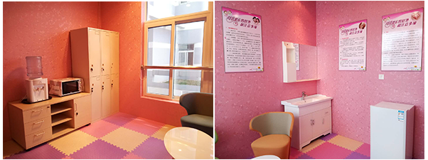 “愛心母嬰室”設(shè)置在活動(dòng)室二樓,面積11平方米,可容納4人同時(shí)哺乳。母嬰室內(nèi)設(shè)施完善,配備冰箱,飲水機(jī),儲(chǔ)物柜,微波爐,洗手池,宣傳標(biāo)識(shí)牌,軟座沙發(fā)等現(xiàn)代化設(shè)施,可以為哺乳媽媽們提供一個(gè)干凈衛(wèi)生、溫馨舒適、安全私密的哺乳環(huán)境。